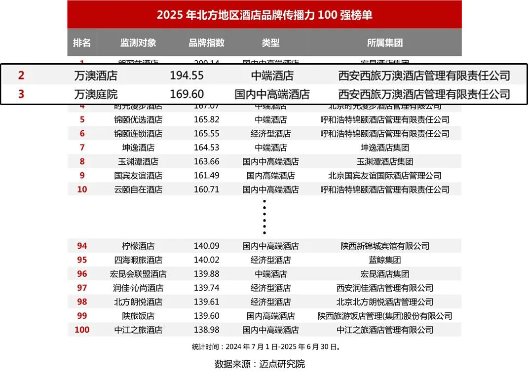 近日,西旅萬(wàn)澳酒店旗下「萬(wàn)澳酒店」&「萬(wàn)澳庭院」憑借廣泛的品牌影響力和出色的創(chuàng)新傳播能力,躍居邁點(diǎn)研究院(MTA)“2025年北方地區(qū)酒店品牌傳播力100強(qiáng)榜單”前三甲。