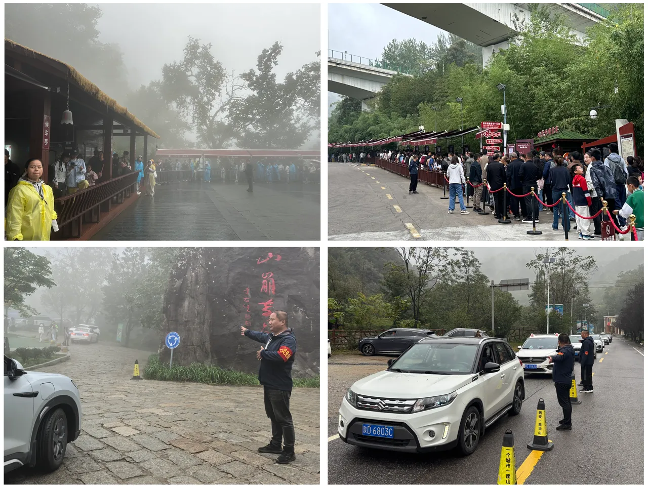針對(duì)假期降雨天氣,兩景區(qū)提前謀劃、精準(zhǔn)施策,構(gòu)建“預(yù)警—響應(yīng)—處置”全流程安全防控機(jī)制。翠華山景區(qū)以“1+5+1”立體化方案體系為核心,開(kāi)展全維度隱患排查,在翠華峰、冰風(fēng)洞等關(guān)鍵區(qū)域設(shè)置專(zhuān)人值守,落實(shí)錯(cuò)峰游覽機(jī)制,確?!坝瓴煌?、服務(wù)不斷、安全不減”。同時(shí)優(yōu)化“線上+線下”購(gòu)票體系,實(shí)現(xiàn)“快速購(gòu)票、快速查驗(yàn)、快速入園”,在陰雨天氣下高效保障游客入園體驗(yàn)。南五臺(tái)景區(qū)依托智慧管理平臺(tái),動(dòng)態(tài)監(jiān)測(cè)客流與天氣變化,聯(lián)動(dòng)駐地政府、交警、公安等多方力量,強(qiáng)化交通疏導(dǎo)。