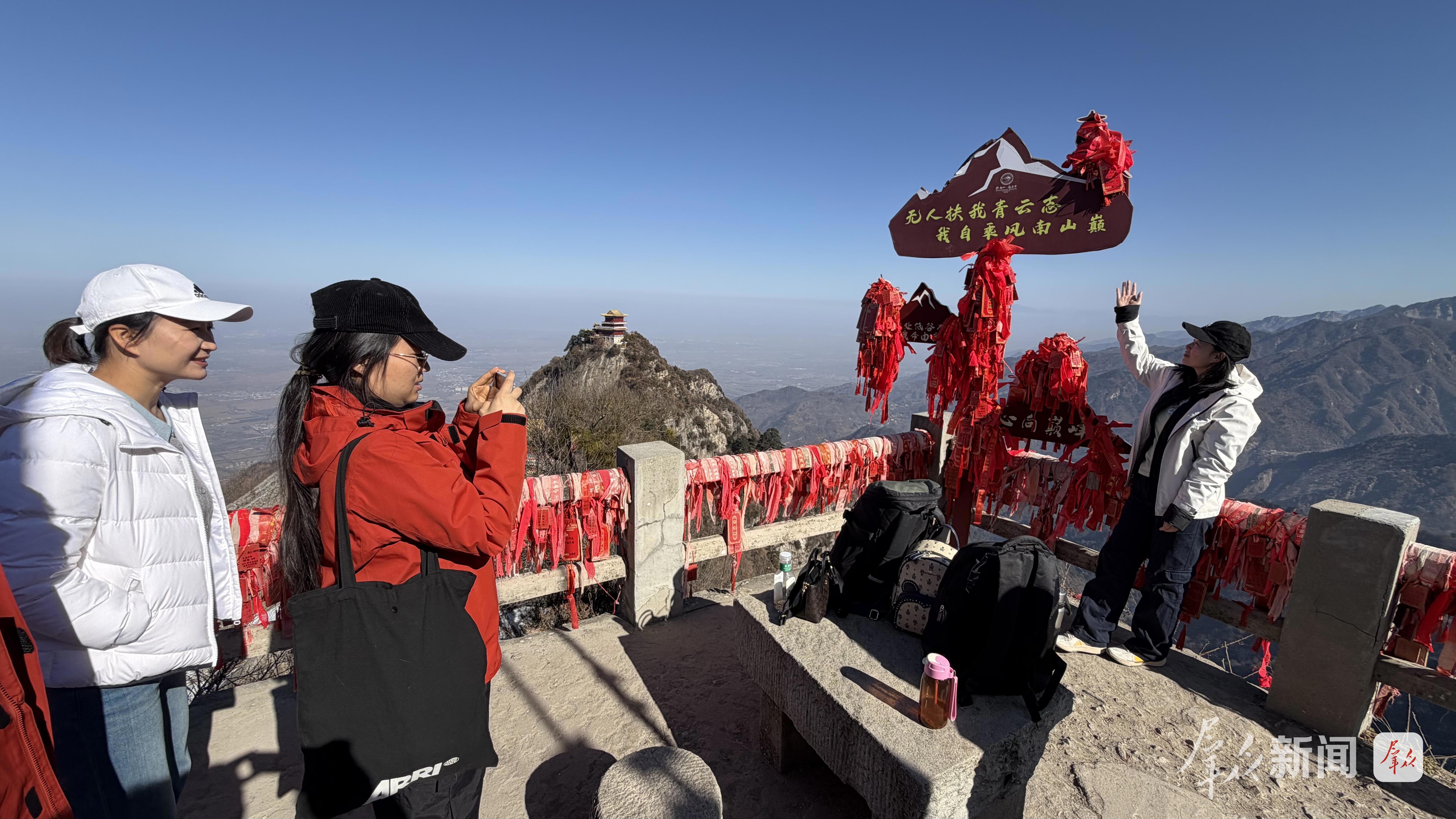 游客們在南五臺山頂拍照打卡,記錄美好。
