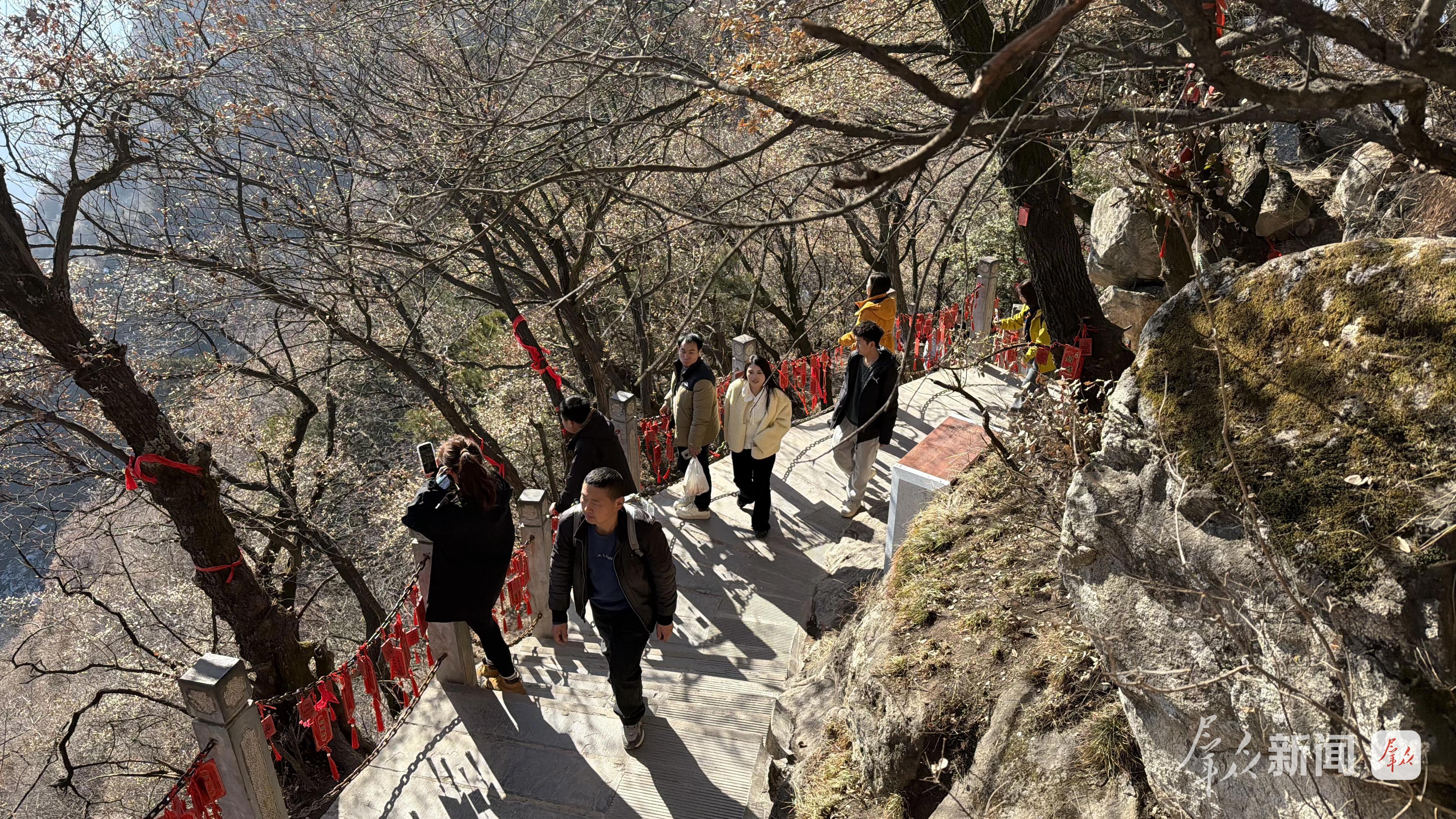 游客們一邊爬山,一邊領(lǐng)略南五臺的冬日美景。