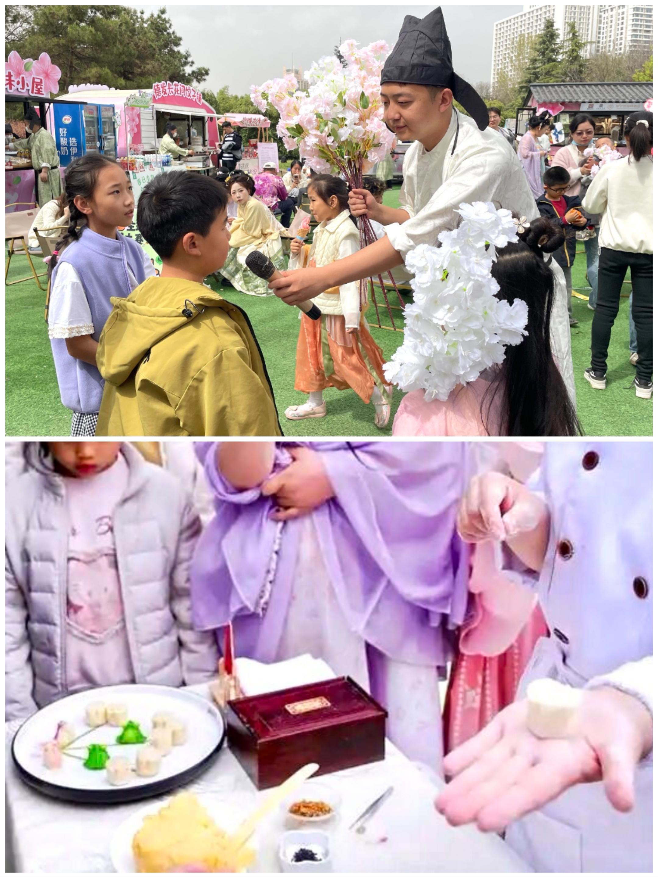 非遺展演區(qū)更是人氣滿(mǎn)滿(mǎn),德發(fā)長(zhǎng)餃子代表性傳承人現(xiàn)場(chǎng)巧手捏制花式餃子,桃李學(xué)院的面塑大師捏出粉色醒獅花饃,吸引孩子們駐足?,F(xiàn)場(chǎng)還舉辦了“曬太陽(yáng)大賽”和飛花令——以“花”“清明”“春”為令對(duì)詩(shī),參與者可獲得桃李學(xué)院、常寧宮等提供的禮品。